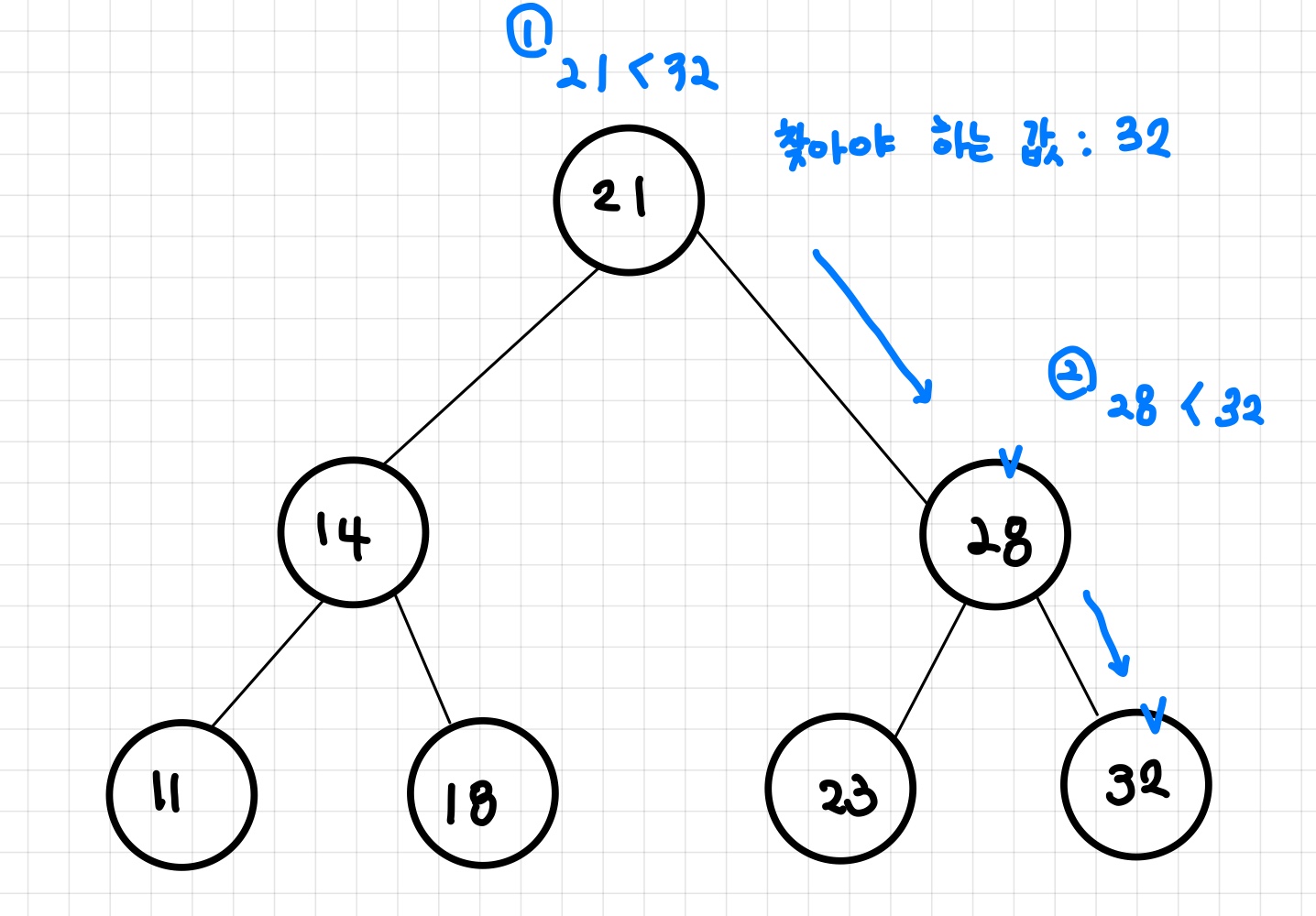 오른쪽 노드에 존재할 것이고 오른쪽 노드의 값인 28 보다 32 가 더 크기 때문에 오른쪽 노드의 오른쪽에 존재할 것이다.
