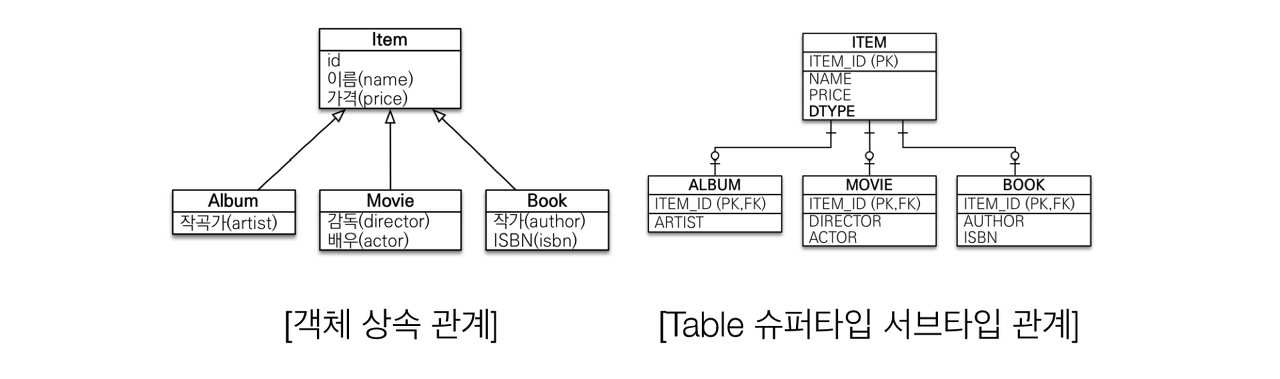 - 데이터베이스에는 상속관계는 없지만, 비슷하게 풀어낼 수 있는 방법이 존재한다.