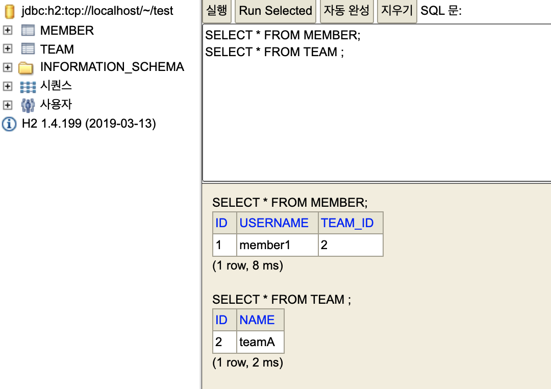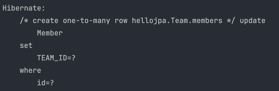 - 객체에서는 team 이 연관관계 주인이 되는데 team 의 List members 의 변화가 있으면 테이블의 member 의 team_id 에 업데이트가 된다.